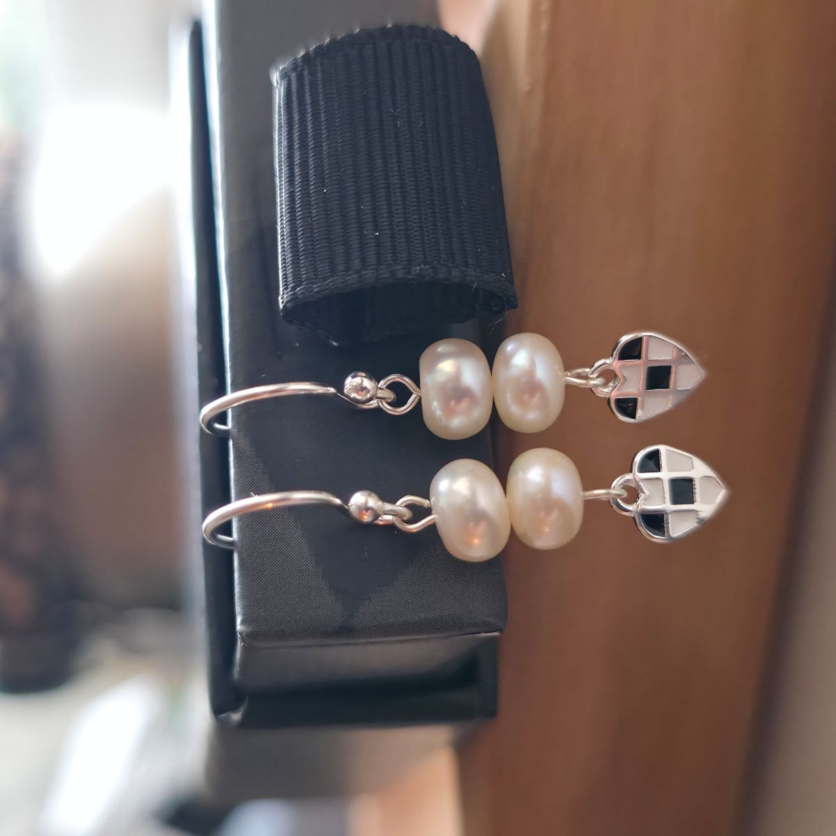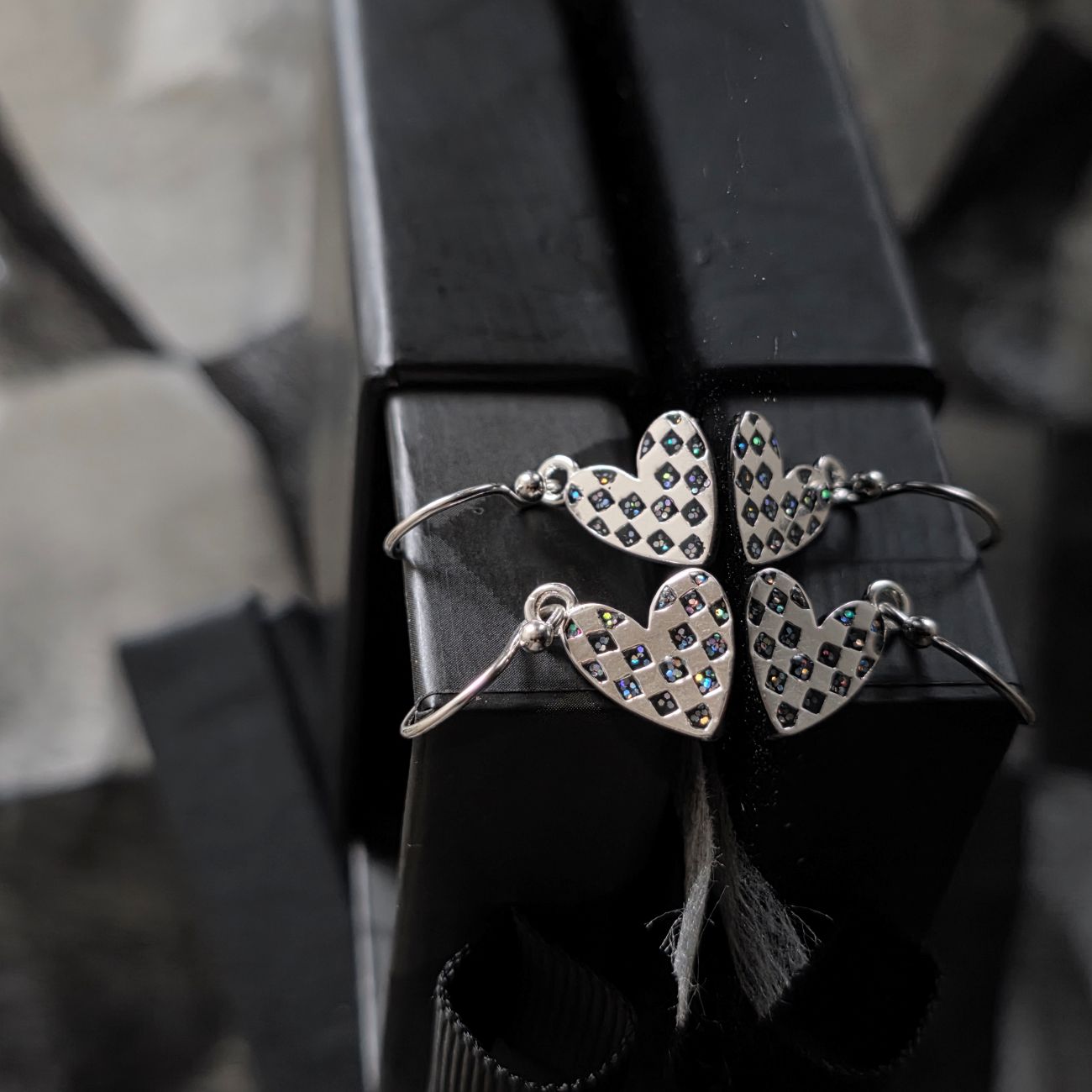 Chequered Heart Black Spinel Drop Earrings in Sterling Silver
