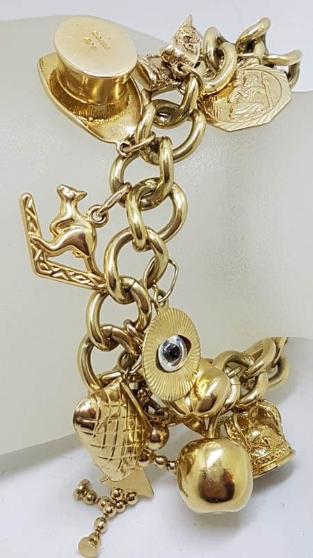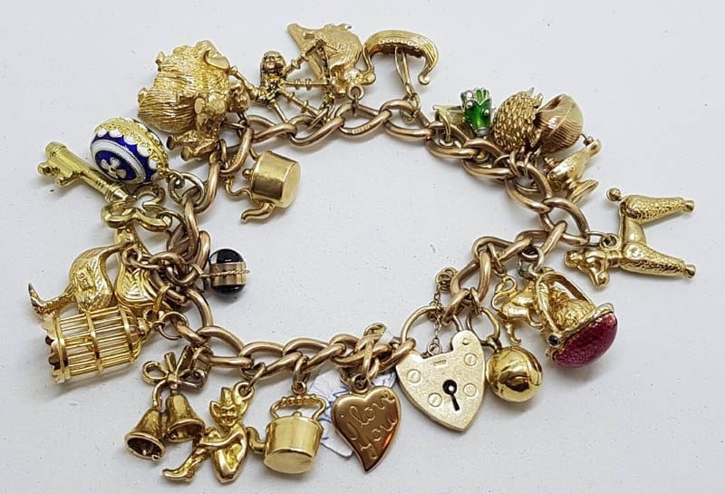 9ct Yellow Gold Heavy and Solid Curb Link Charm Bracelet with Heart Padlock – Including Enamel Charms – Antique / Vintage