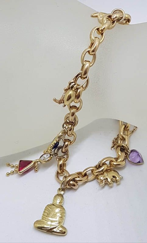 9ct Yellow Gold 9 Assorted Charms Bracelet – Includes Diamond and Cubic Zirconia Charm – Vintage